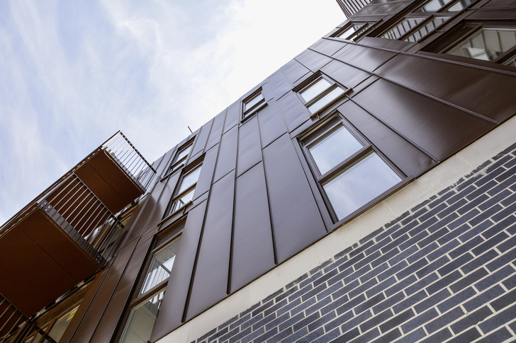 The facades employ both vertical and diagonally laid elZinc Rainbow Brown zinc cladding. Architect Luke Dewey explained, “We initially explored various types of metal cladding, including aluminium and painted steel, but had concerns over durability and long-term maintenance. One of the most important considerations was that the cladding should retain its original appearance for as long as possible. This led to a choice between two materials: bronze alloy or pre-weathered coloured zinc. The design team ultimately favoured zinc for its sheen-like appearance, which is very much in keeping with the site’s industrial heritage. We also admired the material’s ability to subtly absorb and reflect changing light conditions – almost as if it has a life of its own.” The elZinc Rainbow Brown zinc, supplied by SIG Zinc & Copper, was chosen for its warm, bronze coloured tone which Metropolitan workshop felt would perfectly compliment the hues of the existing brickwork. In addition, the product provides, as Luke Dewey says, excellent protection against corrosion, is cost-effective, sustainable and 100 per cent recyclable.