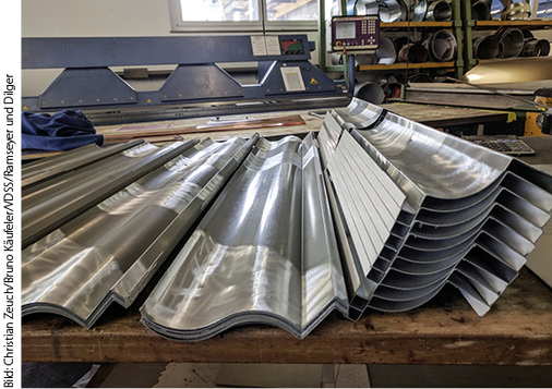 An Rinnen, Gesimsen und Vorsprüngen wurden geschwungene Titanzinkprofile montiert. Die Profil-Formgebung erfolgte per Steppfunktion auf einer Schwenkbiegemaschine des Typs RAS-Flexibend. Sämtliche