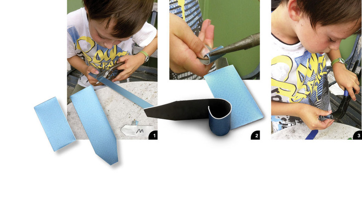 1 Die Herstellung ist kinderleicht. Benötigt werden zwei 2,5 cm breite Blechstreifen: einer 8 cm, ein weiterer 5 cm lang. Den 8-cm-Streifen an einem Ende beidseitig unter 45° ausklinken