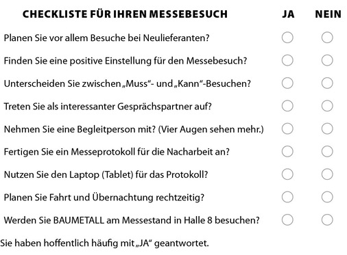 Das Internet bringt wichtige Informationen und ist für die Vorbereitung des Messebesuchs unverzichtbar. Über interessante und neue Aussteller erfährt der Besucher in Inseraten sowie in Beiträgen der Fachpresse. Zur Messevorbereitung gehört auch die Frage: Wen nimmt man mit? Ein Familienmitglied? Einen wichtigen Mitarbeiter? Eine Begleitperson gewinnt Einblick in das Leistungspaket der Aussteller und kann an Entscheidungen teilnehmen.