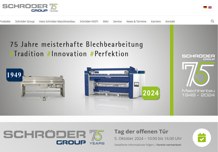 Die für ihre Blechbearbeitungsmaschinen bekannte Schröder Group blickt auf 75-jähriges Bestehen zurück und feiert diesen Anlass mit einem Tag der offenen Tür. Ein detailliertes Rahmenprogramm wird zeitnah bekannt gegeben. Interessenten können sich auf der Webseite des Unternehmens informieren