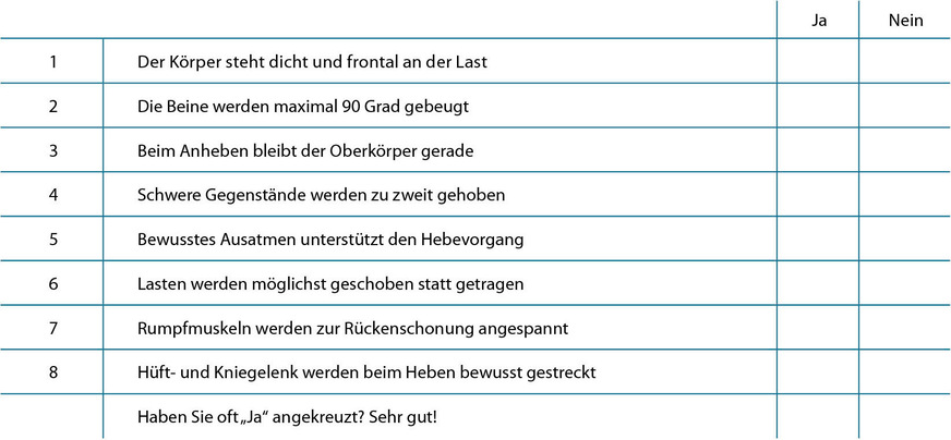 Trotz moderner Technik gibt es körperliche Arbeiten nach wie vor. Auch wenn im eigenen Team noch niemand über Rücken- und Nackenschmerzen klagt, ist es sinnvoll, über Prävention nachzudenken. Denn wenn sich durch falsches Heben von Lasten nach Jahren Schmerzen einstellen, entstehen Fehlzeiten durch Krankheit und Arztbesuche. Damit verbunden ist auch eine erhebliche Leistungseinschränkung. Mit ein paar Tipps lassen sich Rückenschmerzen aber vermeiden. Wer sich beim Heben von Lasten gedanklich auf den Hebevorgang einstellt, bringt seine Muskulatur in einen Vorstartzustand, ähnlich einem 100-m-Sprinter vor dem Start. Beim Heben muss man so dicht wie möglich an den Gegenstand herantreten. Dann geht man mit gestreckter Wirbelsäule in die Hocke herunter. Die Beine werden bis maximal 90 Grad gebeugt. Tiefere Kniebeugen bedeuten eine zusätzliche Belastung und fördern die Knorpelabnutzung. Füße sind mindestens hüftbreit und mit der ganzen Fußsohle aufgesetzt (stabile Ausgangsposition), die Wirbelsäule ist so in ihrer physiologisch richtigen Form.
