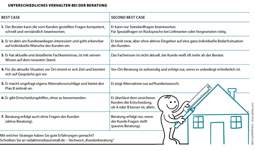 Natürlich ist Beratung zeit- und damit auch kostenintensiv, vor allem wenn sie vor Ort beim Kunden stattfindet. Deshalb muss der Beratende grundsätzlich die Ernsthaftigkeit der Anfrage seines Kunden prüfen. Verhindert werden sollten Situationen, in denen der Kunde am Ende erklärt, es handle sich nur um ein „Informationsgespräch“ und es gebe zum jetzigen Zeitpunkt keinen akuten Handlungsbedarf. Ebenfalls negativ sind Kunden, die erworbene Informationen zum Preisvergleich nutzen, um anschließend einen anderen, wesentlich günstigeren Anbieter zu beauftragen. Es gilt folglich, die Situation schnell zu erkennen und entsprechend zu reagieren. Hilfreich sind beispielsweise Lieferantenschulungen, die dazu beitragen, das Fachwissen permanent zu aktualisieren, um in der Folge optimal zu beraten. Lücken in der Kompetenz zeigen sich meist erst bei anspruchsvollen Objekten. „Aktiv beraten“ heißt, dass der Beratende unaufgefordert Vorschläge einbringt und nicht wartet, bis der Kunde danach fragt. Die Beratungskompetenz ist demnach deutlich eingeschränkt, wenn die Initiative vom Kunden ausgeht bzw. dieser nach Vorschlägen und Alternativen fragt. Ein Indikator für gelungene Beratungsleistung ist ein glaubwürdiges Dankeschön des Kunden am Gesprächsende.
