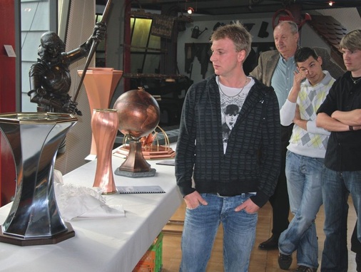 Oktober 2009: Im Europäischen Klempner- und Kupferschmiedemuseum in Karlstadt präsentieren die Nominierten ihre Arbeiten vor einer hochkarätig besetzten Jury. Die fünf Juroren haben die Qual der Wahl. Zahlreiche Kriterien, wie Formgebung, Gesamteindruck, Schwierigkeitsgrad, handwerkliche Umsetzung, Idee und Präsentation, werden im Bewertungsschema erfasst. Die Bewertungsprozedur beginnt mit der Präsentation der Meisterstücke. Die von den Nominierten gelieferten Hintergrundinforma-tionen lassen deren Arbeiten in einem gänzlich neuen Licht erscheinen. Von mancher Objekt-Schilderung sichtlich beeindruckt, weitet sich der Blick der erfahrenen Juroren und beeinflusst das Endergebnis maßgeblich.