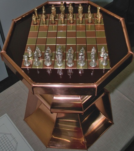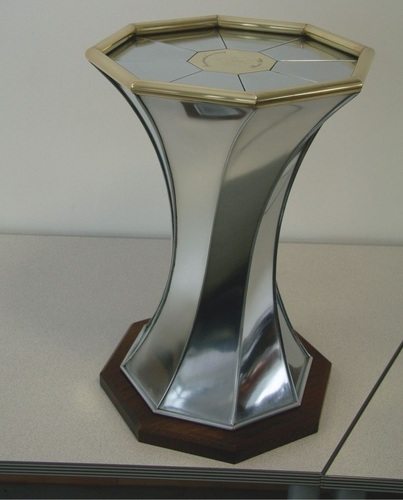 Der von Florian Stuber aus walzblankem 0,7-mm-Titanzink hergestellte achtteilige und gedrehte Tisch überzeugt durch absolut perfekt ausgearbeitete Details. Die nach außen geführten 4-mm-Stehfalze sind formvollendet. Eine 6-mm- Drahteinlage bildet den Sockelabschluss. Oben ist das Meisterstück durch acht nach innen gefalzte Teile geschlossen, in deren Mitte sich ein graviertes Messingschild befindet. Alle Falze sind von innen punktgelötet. Ein 18 mm starkes, geschlitztes Messingrohr bildet den oberen Abschluss. Der Tisch ist 550 mm hoch, der obere Durchmesser beträgt 380 mm, der untere 304 mm.