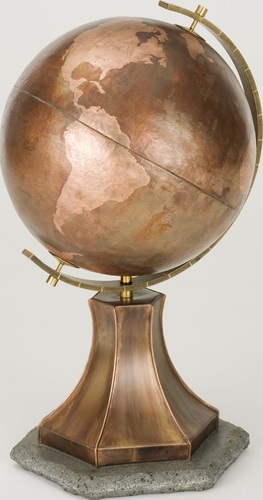 „Vintage-used-look-Globus“ mit getriebener Kugel. 6-teiliger Sockel, nach innen gefalzt und ca. 200 mm hoch. Kugel aus 1,4 mm Kupfer getrieben, gepoltert und aufgezogen