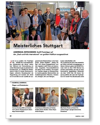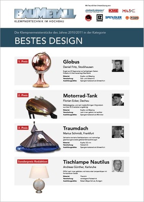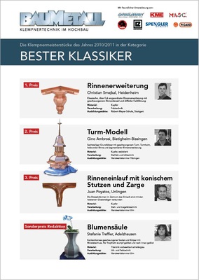 Für zehn Klempnermeister ist der 10. Dezember 2011 ein außergewöhnlicher Samstag. Früh morgens laden Sie ihre kürzlich gefertigten Meisterstücke in Pkws oder Lieferwagen und begeben sich auf den Weg nach Münchingen bei Stuttgart. Ihr Ziel: Der Firmensitz der Werksvertretung Engelhardt. Ihre Motivation: Hohe Siegchancen auf die Auszeichnung „Meisterstück des Jahres“. Ohnehin haben die zehn Jungmeister durch ihre Nominierung bereits gewonnen, denn sie gehören laut BAUMETALL-Leserwahl zu den Besten der Besten. Was sie noch nicht wissen ist, welchen Podiumsplatz sie belegen werden.