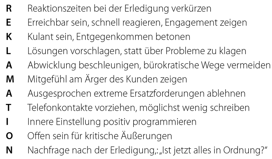 Die erste Reaktion ist die Anteilnahme am Ärger des Kunden: „Ja, das kann ich gut verstehen“ oder „Ich kann mir vorstellen, dass Sie verärgert sind“, Verständnis entgegenbringen ist für Kunden so viel wie Wertschätzung und bedeutet kein Schuldeingeständnis. Auf das übliche und wirkungsschwache „Tut mir leid“ muss verzichtet werden. Statt der Anteilnahme am Ärger kann man den Reklamierenden auch mit der „Zielformulierung“ beeinflussen: „Jetzt kommt es auf eine schnelle Lösung an“ oder „Wir legen Wert darauf, dass Sie zufriedengestellt werden“. Reklamationen können bei der Weiterentwicklung des Services oder der Abwicklung neuer Aufträge Chancen sein. Daher ist die Beachtung folgender Punkte bei der Reklamationsbearbeitung wichtig: