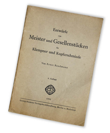 Dieses kleine Ideenbüchlein ist etwas Außergewöhnliches. Bereits im Jahre 1920 stellte der damalige Schriftleiter der „Deutschen Klempner-Zeitung“, Herr Waldemar Petit, auf Anregung vieler Kollegen diese Sammlung zusammen und hat damit unseren Fachkreisen einen großen Dienst erwiesen. Da sich im Laufe der Jahre die künstlerischen Formen gewandelt haben, das Interesse an kunstgewerblichen Gehrungsarbeiten jedoch nach wie vor vorhanden ist, kam es zu immer neu überarbeiteten Auflagen. Die mir vorliegende 6. Auflage aus dem Jahre 1950 zeigt auf 24 Buchseiten in DIN A5 insgesamt 20 Entwürfe für Meister- und Gesellenstücke für Klempner und Kupferschmiede von Klempnermeister und Fachlehrer Ernst Bandmann, Berufsschuldirektor Bruno Berger und Fachschuldirektor Emil Thom. Dargestellt werden anspruchsvolle kunsthandwerkliche Entwürfe wie Obstschalen, Vasen, Pokale, Tee- und Weinkannen, Keksdosen, Hosenrohre, Rinnenkessel, Flurlaternen, Wandbeleuchtungen sowie Tischlampen und ein Schreibzeugset. Auf jeder Buchseite wird ein Entwurf präsentiert und mit einer sehr kleinen grafischen Schwarz-Weiß-Darstellung ergänzt. Vorschläge zu Material und andere praktische Hinweise zur Ausführung von Details dürfen dabei nicht fehlen.