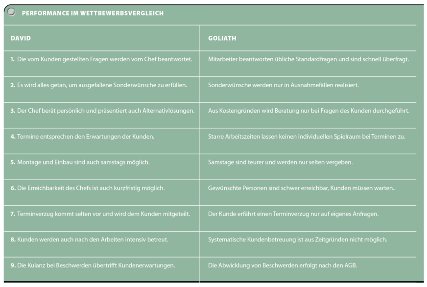 Um wettbewerbsfähig zu sein, muss man sich selektiv auf kleinere Aufträge aus der Region konzentrieren, zielgruppenorientiert auftreten und auf Großobjekte verzichten. Während sich „Goliath“ vorwiegend mit Großaufträgen befasst, kann „David“ gezielt auf individuelle Kundenanforderungen eingehen. Je kleiner der Betrieb, desto wichtiger sind die DNA und das Image als Alleinstellungsmerkmal. Je mehr sich ein Anbieter dadurch differenzieren kann, umso einzigartiger tritt er in Erscheinung. Schwerpunkte setzen und die eigene Unique Selling Proposition, also das Alleinstellungsmerkmal, ausspielen, damit man als Leistungsträger wahrgenommen wird – darauf kommt es Kunden an. Es hat sich bewährt, eine eigene Identität zu schaffen, die unverwechselbar ist: Nicht der Auftrag, sondern der Kunde als „Marke Mensch“ steht im Blickpunkt.
