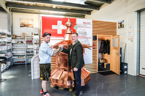 Auch wenn sich die Mietspengler-Einsätze vorwiegend auf die Ostschweiz beschränken, schrecken die Mietspengler keineswegs vor Herausforderungen in anderen Gefilden zurück. Sie lieben es, möglichst coole Projekte zu realisieren. Eines davon ist der Kupferturm für Martin. Niggi holt tief Luft und beginnt zu erzählen: „Martin Fischer hat mich in der Gründungsphase der Mietspengler mit besonders attraktiven Werkzeugangeboten unterstützt. Das hat den Start in die Selbstständigkeit extrem vereinfacht. Die praxiserprobten Werkzeuge vom M.A.S.C-Team in Vöhringen sind nicht nur unheimlich stabil und langlebig, sondern auch entsprechend vielseitig einsetzbar. Als Dankeschön für die wertvolle Unterstützung habe ich über die Wintermonate einen großen Kupferturm angefertigt. Es ist mein erster Turm. Und es ist der erste Turm, den Martin Fischer geschenkt bekam. Verdient hat er es allemal, denn Martin Fischer ist viel mehr als nur ein Werkzeughändler. Seine Beratungen sind enorm hilfreich, und von seinem Team sowie von seinem Netzwerk zu profitieren, ist überaus wertvoll.“