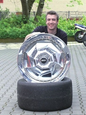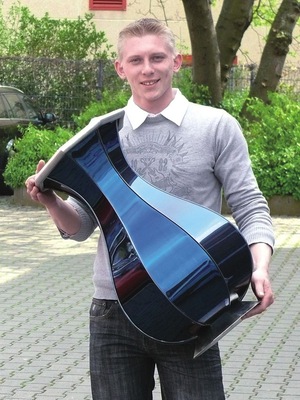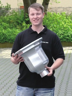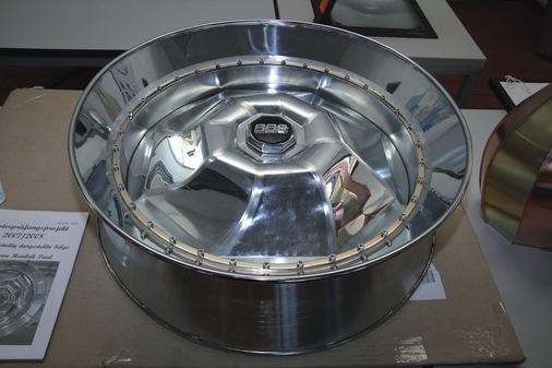 Bei strahlendem Sonnenschein präsentieren die „Spenglermeister 2008“ ihre Meisterstücke. Dabei hinterlassen die Prüfungsstücke einen glänzenden Eindruck – besonders die von Paul Hendrik gefertigte, hochglanzpolierte Titanzink-Felge. Reichlich Sonnenschein und noch mehr kompetentes Fachwissen spiegeln sich in diesem extravaganten Auto-Zubehör wider. Ein aus zwei Kegelstümpfen bestehender Felgenkranz umschließt acht gedreht angeordnete und stumpf verlötete Segmente. Edelstahlschrauben und verchromte Halteringe verbinden die Bauteile miteinander. Ein gerundetes und genutetes verchromtes Kupferrohr bildet den Abschluss.