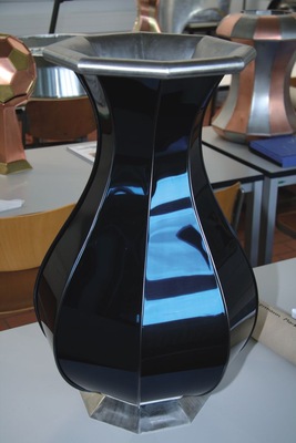 Die Segmente des achteckigen Vasenaußenteils aus 0,5 mm starkem kobaldblauem Edelstahl sind durch 3 mm hohe einfache Stehfalze verbunden. Das aus 0,8 mm starkem, walzblankem Edelstahl bestehende Innenteil mit abschließendem Wulst ist WIG-geschweißt.Das Material: Inox-Color färbt in seinem Werk in Walldürn nichtrostenden Stahl nach dem Inox-Spectral-Verfahren. Verarbeitet werden Tafelgrößen bis zu 6,0 x 1,2 x 2,0 m, Streckmetalle, Drahtgewebe, Profile und andere Bauelemente. Bei dem Verfahren handelt es sich um einen rechnergesteuerten elektrochemischen Prozess, bei dem eine transparente Chromoxid-Schicht aufgebaut wird. Es werden also keine Farbstoffe oder Pigmente aufgetragen. Durch die geringe Dicke der Chromoxid-Schicht kommt die Struktur der gefärbten Flächen ungeschmälert zur Wirkung. Nicht nur die optische Qualität, sondern auch die funktionellen Material-Eigenschaften bleiben erhalten.