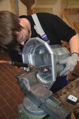 Lernen, weil Bildung begeistert! So lautet das Motto der Spengler-Meisterschule Schweinfurt. Seit mehr als 25 Jahren bildet die Handwerkskammer für Unterfranken erfolgreich Spenglermeister aus. Bereits in den frühen Jahren hat der heutige Vorsitzende des Meisterprüfungsausschusses, Franz Kimmel, äußerst aktiv mitgewirkt. Zuletzt im sechsmonatigen Vollzeitkurs 2007/2008, in dem 16 Meisterschüler dem lange ersehnten Ziel „Spenglermeister“ entgegeneiferten. Die durchschnittlich 25 Jahre jungen Schüler beschäftigten sich neben der praxisnahen Qualifikation, die zur Ausübung einer Meisterposition in einem Spenglerbetrieb befähigt, mit Themen wie dem Anfertigen von kunsthandwerklichen Gegenständen, dem Treiben von Metallen oder dem Bekleiden von Innenräumen mit Metall. Auch die Planung von Auftragsabwicklungsprozessen, Kalkulation oder Kommunikation für Kunden- und Verkaufsmanagement waren Unterrichtsbestandteil in den modernen Theorieräumen und Werkstätten.
