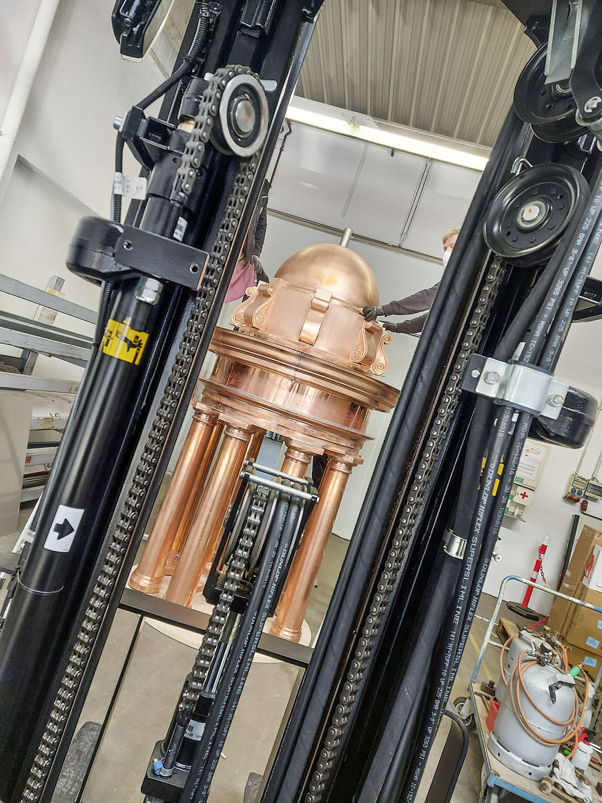 Der Aufwand, beide Turmhälften durch die Werkräume zu manövrieren, erhöhte sich mit fortschreitender Fertigung. Durch die zunehmende Zahl montierter Bauteile stiegen natürlich auch die Größe und das Gewicht der Hälften. „Die Fertigung der unteren Turmhälfte erfolgte zunächst im liegenden Zustand. Zur ‚Hochzeit’ wurde das Bauteil dann aufgerichtet“, so der Fachmann. Bevor die obere Turmhälfte die untere „heiraten“ durfte, mussten beide Hälften in eine andere Fertigungshalle mit höherer Decke umziehen. Nach dem Aufrichten setzten nur noch zwei Mitarbeiter die Montage fort, indem sie die Halbkugel samt Zierkonsolen auf der unteren Turmhälfte befestigten. Der runde Gesimskranz wurde mit einem darüberliegenden Anschlussprofil verlötet. An dieser Naht erreicht die Bekrönung ihren maximalen Durchmesser von 1,5 m. Besonderes Augenmerk legten die Mitarbeiter des Handelshauses auf die Vorbereitung des Transports. Die Spengler fertigten ein spezielles Transportgestell, das die 2,75 m hohe Bekrönung in gedrehter Position im Container fixiert – ohne Kreuz, das extra verstaut wurde. Im März waren alle Bauteile sicher im Container untergebracht. Nach der Schiffsreise, die Mitte April startete, und der Ankunft in den USA stehen noch einige finale Arbeiten an. Günther Huber wird mit seinem Fachbetrieb Ornametals Manufacturing das Kreuz auf die Bekrönung setzen und diese auf der Kirche montieren. Das Team aus Neu-Ulm ist schon gespannt und rät, auch an die wasserdichten Lötnähte unter dem Kreuz und am Dokumentenfach zu denken. (Fortsetzung folgt)