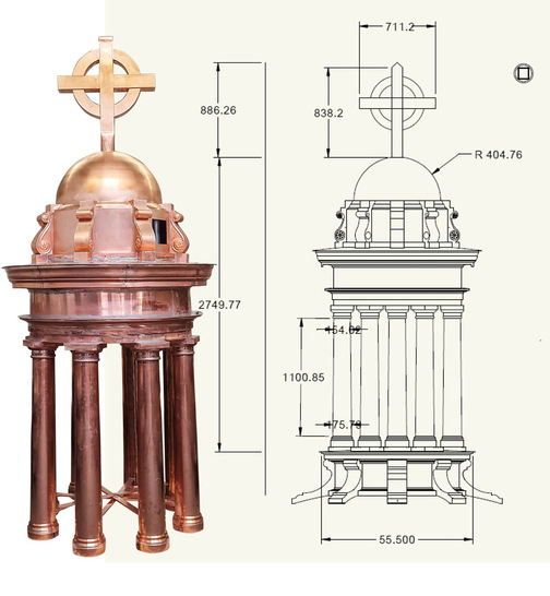 Zahlreiche Details forderten die Spengler beim Bau der Bekrönung aus walzblankem Kupfer, die stattliche 3,64 m hoch ist. Kilian Schleier betreute die Arbeiten ab dem Beginn der Fertigung Ende Januar 2021, nachdem er 2019 schon das Angebot für das Projekt erstellt hatte. Der Experte für Bau-, Bedachungsartikel und Ornamente bei Kaufmann Ulm erklärt die Vorbereitungen: „Um mit der Fertigung beginnen zu können, wurde zunächst eine 1 : 1-Zeichnung erstellt. Anhand dieser Zeichnung konnte die Fertigung der Drückteile und leicht konischen Säulen beginnen. Des Weiteren standen die Radien für die rund gestanzten Profile fest, woraufhin die Herstellung der Stanzwerkzeuge startete.“ Die konische Form der rund 1,10 m hohen Säulen ist erst aus der Nähe zu erkennen. Denn der Durchmesser im unteren Bereich einer Säule beträgt 175,73 mm und ist damit nur gut 21,7 mm größer als der Durchmesser oben (154,02 mm). Für die acht Säulen wurden 16 Kupferringe mit Wulst gefertigt, die die Säulen dekorieren. Anhand der ermittelten Radien für die Gesimsprofile stellte das Team von Kaufmann sämtliche Stanzwerkzeuge selbst her und stempelte die Radiusprofile auf dem werkseigenen Fallwerk. Die gestempelten Radiusprofile wurden anschließend zu einem kreisrunden Kranz zusammengeschweißt.