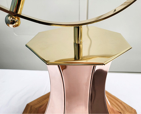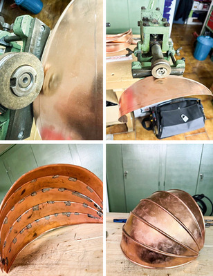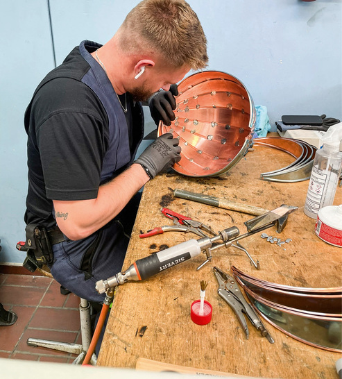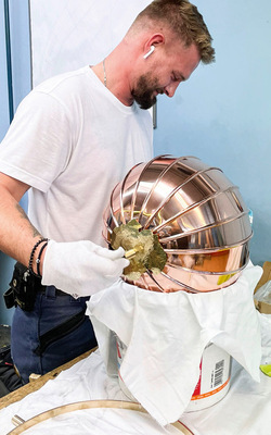 Stilistisch völlig anders, aber ebenso beeindruckend ist das Meisterstück von Felix König: ein kunstvoller Spenglerglobus. König fertigte eine 18-teilige Weltkugel aus Kupfer, die auf einem achtteiligen Kupfersockel befestigt ist. Die einzelnen Globuselemente verfügen über filigrane Sicken, die König sorgsam aneinandergesetzt und durch Weichlöten miteinander verbunden hat. Die Kontinente aus lasergeschnittenem Messingblech hat er anschließend auf den Globus geklebt. Besonderes Augenmerk verdienen die Sockelelemente. Sie sind durch ineinander eingehängte Falze miteinander verbunden. Die achteckige Abdeckung des Sockels besteht aus Messingblech.