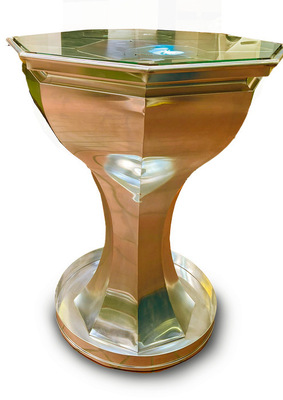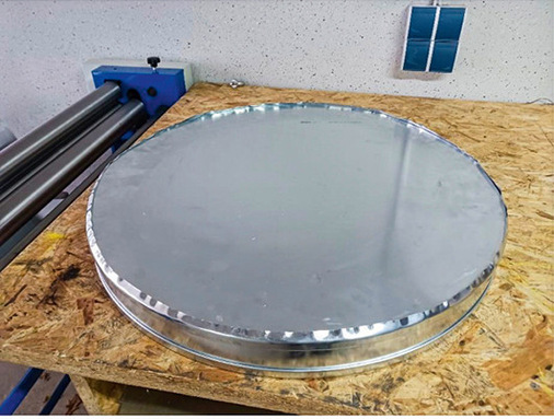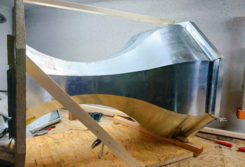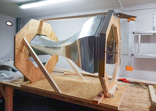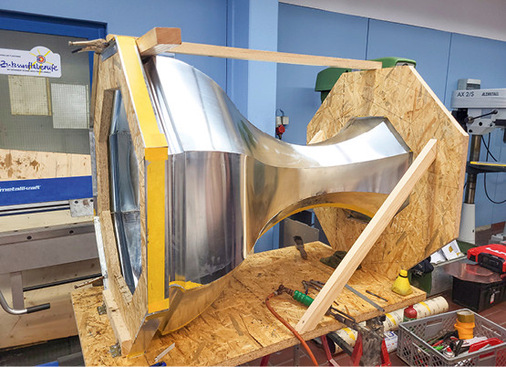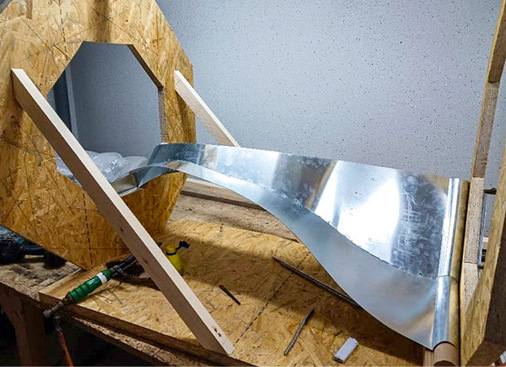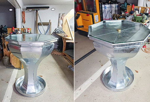Die Meisterprüfungsstücke von Nico Bauernfeind und Felix König zeugen von außergewöhnlichem handwerklichem Können und kreativer Gestaltungskraft. Nico Bauernfeind überzeugte mit einem achteckigen Stehtisch aus Titanzink, der durch seine präzise Verarbeitung und die Kombination verschiedener Techniken besticht. Die aus Titanzinkband gefertigten Elemente des Tischsockels hat Bauernfeind durch einen Pittsburghfalz miteinander verbunden. Eine Zierkiesfüllung sorgt für entsprechende Standsicherheit. Das mittlere, dreiteilige Tischelement besteht aus einer konvex-konkav geformten Konstruktion, deren Elemente innenseitig stumpf verlötet und mit dem Sockel vernietet wurden. Die Tischplatte setzt sich aus mehreren verfalzten Segmenten zusammen. Zur zusätzlichen Fixierung hat Bauernfeind einige Lötpunkte gesetzt. Den oberen Abschluss bilden stumpf verlötete Wulstelemente. Sie tragen das Gewicht der 8-mm-Glasplatte, die mit aufgeklebten Kunststoffhaltern und speziellen Messingscheiben gegen Verrutschen gesichert wurde.