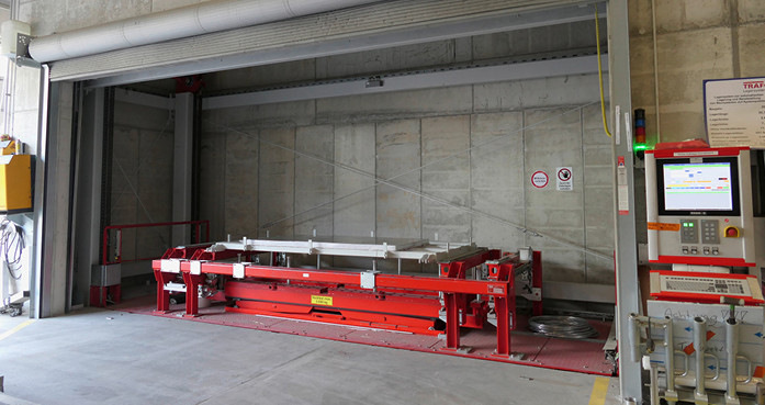 Im Profilmanipulator selbst ist keine Spaltanlage integriert. Die vorgefertigten Zuschnitte werden auf einem Tisch positioniert und anschließend an das während des Betriebs geschlossene System übergeben. Dies kann durch zwei Tore an unterschiedlichen Stellen im Sicherheitssystem erfolgen. So können verschiedene Zuschnitte und Materialien für die Weiterverarbeitung in der Anlage auf Abruf bereitgehalten werden. Das Unternehmen arbeitet mit Großtafelformaten und verfügt außerdem über eine Längs- und Querteilanlage. Beim Blick durch die hochmoderne Werkstatt fällt jedoch auf: Es fehlt an Material. Ein großer Schacht auf der anderen Seite der Halle birgt des Rätsels Lösung.
