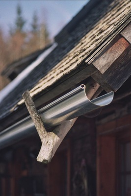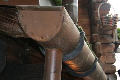 Die abgewinkelte Verwachsung am Fuß des Stammes eignete sich hervorragend als Rinnenwinkel. Eine nach oben verlaufende Verjüngung passte exakt zur benötigten Rinnenlänge, denn schließlich fällt am Rinnenhochpunkt deutlich weniger Wasser an, als am Rinnenauslauf. Nachdem die Holzbearbeitung abgeschlossen war, wurde ein Schmied mit der Herstellung der Rinnenhalter beauftragt. Ähnlich der Beschlagung eines Pferdes, wurde jeder Halter an die Form des entsprechenden Rinnenabschnittes angepasst. Das hochkant geschwungene Flacheisenmaterial wurde seitlich an den Dachsparren angebracht. Auf ein Traufprofil im klassischen Sinne wurde verzichtet. Dafür entschied sich der Bauherr zur Unterdrückung von Moos- und Flechtenwachstum, Kupferfirstprofile anbringen zu lassen.