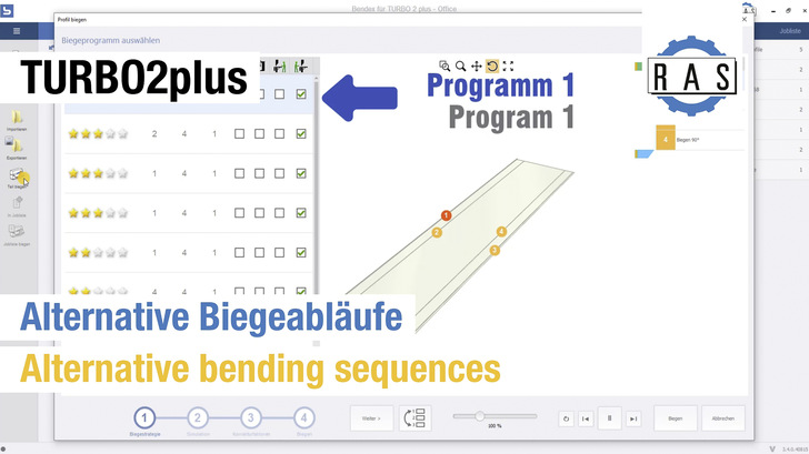 In den nachfolgenden Beispielvideos sind die Abläufe anhand der Bendex-Software für die RAS TURBO2plus Schwenkbiegemaschine dargestellt. In vergleichbarer Weise läuft es auch mit der FLEXI2bend ab.