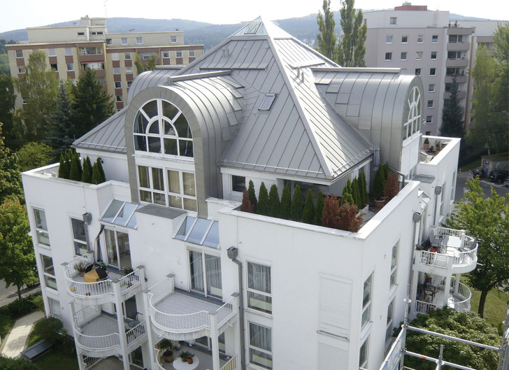 In Taunusstein leben etwa 30000 Einwohner. Die größte Stadt des Rheingau-Taunus-Kreises in Hessen liegt zwischen Wiesbaden und Limburg. Im Stadtteil Hahn wurden in den frühen 1990er Jahren drei baugleiche, hochwertig ausgestattete Mehrfamilien-Wohneinheiten mit Tiefgarage errichtet. Die großen und ursprünglich mit Bitumenschindeln eingedeckten Pyramidendächer wurden am Firstpunkt mit einer Glaspyramide als natürliche Lichtquelle versehen. In jede der vier Dachseiten integrierten die Planer große titanzinkbekleidete Tonnengauben (Gaubenbreite ca. 400 cm). Direkt unterhalb des Daches befinden sich auf einem Geschoss vier exquisite Wohnungen mit jeweils großzügigem, teilweise überdachtem Balkon. Das Hauptdach sowie die in Falztechnik mit Titanzink gedeckten Gauben, sind als belüftete Konstruktion ausgebildet.