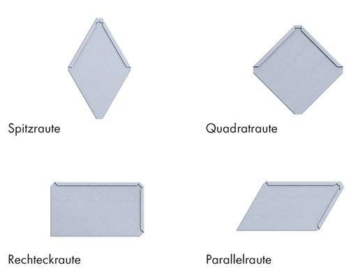 - Abmessungen und Bedarf der SpitzrauteMin. Sichtfläche 302 x 210 mm, 26,74 St./m²Max. Sichtfläche 685 x 428 mm, 6,26 St./ m²