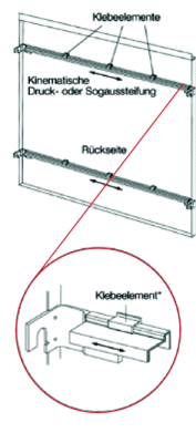 Eine Konzeptionsmöglichkeit besteht darin, in den seitlichen Kantstegen Agraffen (so genannte Schweineohren) auszustanzen, beziehungsweise statisch stärker belastbare, stranggepresste Haken einzunieten. Die fertige Kassette wird dann zur Montage auf Bolzen in eine Aluminium-Unterkonstruktionsschiene eingehängt. Je nach Kassettengröße, statischer Anforderung oder zu erwartenden Windlasten können kassettenrückseitig Ausstei-fungen aus stranggepressten Aluminium-Profilen eingeklebt und/oder mechanisch befestigt werden. Diese sollten idealerweise ebenfalls kinematisch sein, um Ausdehnungen aufnehmen zu können und somit die gewünschte Oberflächenplanheit zu gewährleisten.
