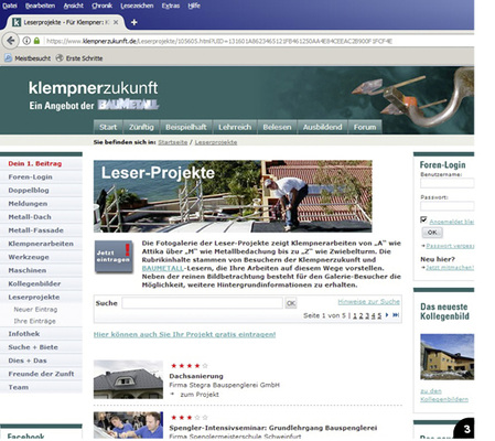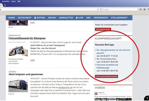 Haben Sie eine knifflige Frage oder stehen Sie vor einem fachlichen Problem, zu dem Sie gern die Meinungen und Erfahrungen anderer Klempner hören würden? Oder sind Sie neugierig, was Branchenkollegen umtreibt? Dann gehen Sie in der rechten Menüspalte ein Stück weiter nach unten bis „Klempnerzukunft“ (1). Hier sind stets die neuesten Beiträge in dieser Leser-Plattform gelistet.