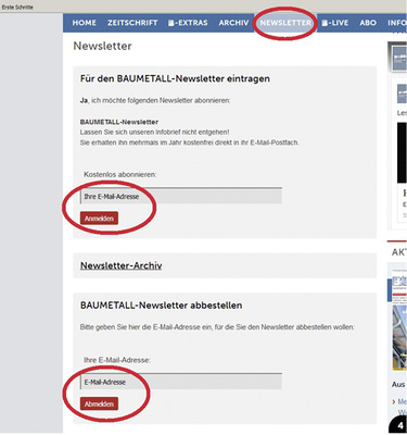 Schauen Sie mal vorbei. Es lohnt sich! Und damit Sie nichts Wichtiges verpassen, verschicken wir aktuelle Infos, Hinweise und Ankündigungen im BAUMETALL-Newsletter. Der ist gratis und ganz einfach zu abonnieren. Gehen Sie dazu in der Menüleiste auf „Newsletter“ (4) und geben Sie Ihre E-Mail-Adresse in das Feld bei „Kostenlos abonnieren“ ein. Anschließend müssen Sie nur auf „Anmelden“ klicken. Genauso einfach können Sie den Newsletter wieder abbestellen, indem Sie sich bei „BAUMETALL-Newsletter abbestellen“ abmelden.