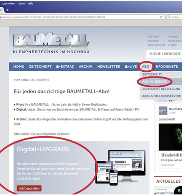Für die (schon heute und künftig) Online-Affinen steht BAUMETALL übrigens auch in einer digitalen Version zur Verfügung. Der Vorteil: Im E-Paper können alle Links direkt angeklickt werden, auch Verlinkungen zu E-Mail-Adressen. So kommen Sie ohne Umwege zu weiterführenden Informationen und können sich beispielsweise sofort für einen Workshop anmelden oder Details erfragen. Und mit der digitalen Zeitschrift haben Sie immer die Nase vorn: Sie erscheint immer drei bis vier Tage, bevor die Printausgabe verschickt wird. Das E-Paper ist wahlweise ein Alternativ- oder ein Zusatzangebot zum Printheft. Unter „Abo“ (5) und „Abo-Angebote“ in der Menüleiste können Sie Ihr Print-Abo um das E-Paper erweitern („Digital-Upgrade“) oder weiter unten ein E-Paper-Abo wählen („Digital + Archiv“) – probieren Sie es aus!