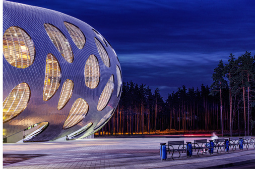 Die Metall-Schindeln stammen aus der Produktion der Firma Böhme Systems. Fast 1000 km legten sie von Boxdorf bei Dresden bis nach Weißrussland zurück. Dort eingetroffen entwickelte sich die Montage zur Herkules-Aufgabe, um das geradlinige Raster an die gewölbte Oberfläche und die runden Öffnungen anzupassen. Diese auffälligen Flächen erlauben spannende Blicke durch die Fassade, die somit nicht nur leicht wirkt, sondern auch die Transparenz der Arena symbolisch unterstreicht.