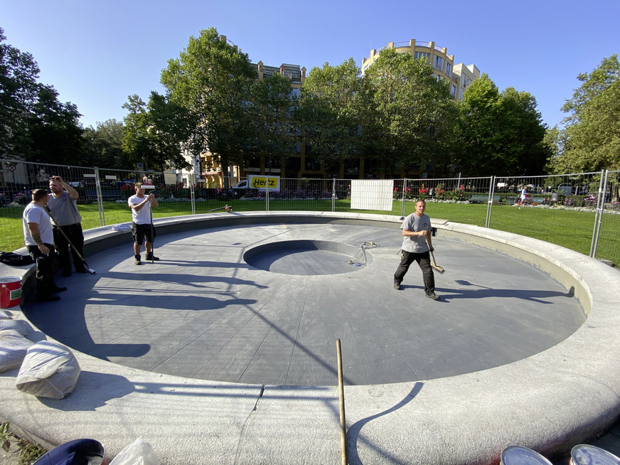Am Prager Platz, wo normalerweise eine Wasserfontäne bis zu 7 m in die Höhe schießt, bot sich noch bis vor Kurzem ein trauriger Anblick. Das 1986 im Zuge der Neugestaltung des Platzes errichtete steinerne Brunnenbecken war leer und trocken. An Seitenwänden und Bodenfläche hatten die Zeichen der Zeit sichtbare Spuren hinterlassen. Im vorigen Jahr traten plötzlich große Risse an der Brunnenschale auf. Zeitweilig stand der Platz unter Wasser. Um die Verjüngungskur des bei der Bevölkerung sehr beliebten Springbrunnens erfolgreich durchzuführen, wurde eine Bestandsanalyse vorgenommen, ein Sanierungskonzept entwickelt und im September 2020 mit den Arbeiten begonnen. Zunächst musste die Altbeschichtung restlos entfernt werden. Dazu wurden die Oberflächen gefräst bzw. kugelgestrahlt und sorgsam gereinigt.
