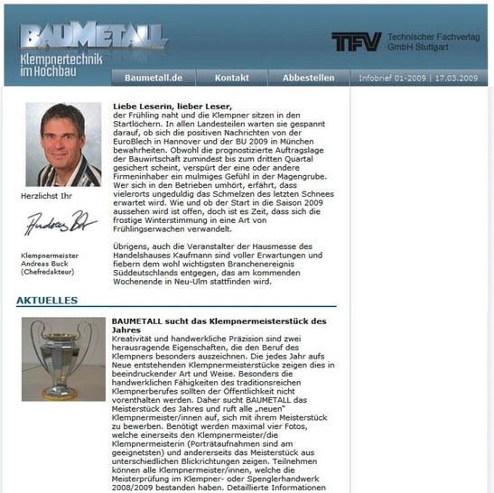 Kennen Sie schon den Newsletter der BAUMETALL? Nein? Dann sollten Sie sich dringend anmelden, denn der „BAUMETALL-Infobrief“ ist anders. Er nervt keineswegs mit unwichtiger Werbung, die in dreitägigem Rhythmus Ihr Postfach blockiert. Im Gegenteil, Sie erhalten den Infobrief nur dann, wenn tatsächlich branchenrelevante Nachrichten zu vermelden sind, wie jüngst im Vorfeld der Hausmesse bei Kaufmann oder beim Aufruf zum Klempnermeisterstück des Jahres. Probieren Sie es einfach aus, denn abmelden können Sie sich bei Nichtgefallen jederzeit. Und das Beste: der Service ist für alle Leser, gleichgültig ob Abonnent oder mitlesender Azubi, kostenfrei. Infos und Anmeldung auf https://www.baumetall.de/ .