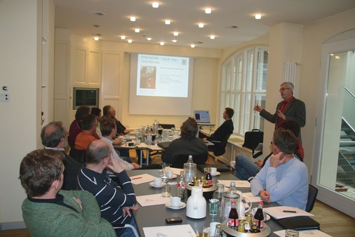 Die Fachleute sprachen über Trends und Entwicklungen aus der Klempnerbranche. Zudem organisierte die SHK Brandenburg einen Fachvortrag über dachintegrierte Solaranlagen. Thomas Hänseroth, technischer Berater bei Rheinzink, berichtete über die bereits seit einigen Jahren erfolgreich eingesetzten Rheinzink-Solarsysteme. Dabei wurden die Rheinzink-Quick-Step-Solarthermie und Quick-Step-Solar-PV-Systeme vorgestellt. Aktuelle Statistiken über die Energieausbeute ergänzten die technischen Informationen. Im Anschluss entfachten die Mitglieder beider Fachgruppen ein wahres Diskussionsfeuerwerk. Dabei erstreckten sich die Themen neben neuen Zukunftsmärkten im solaren Bereich über Lob und Kritik am Klempnertag bis hin zu wichtigen Aktivitäten für eine erwartungsvolle Klempnerzukunft.