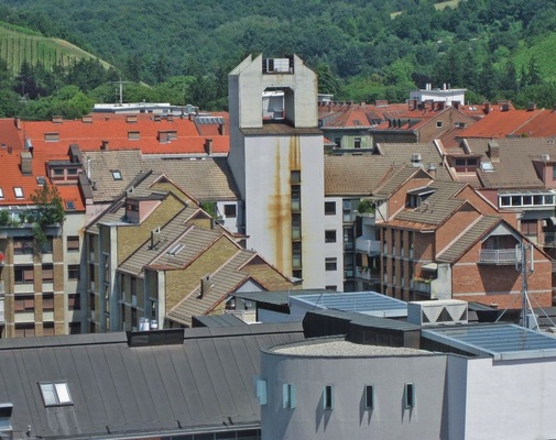 Baumetall-Autor Marc Warzawa war vor einiger Zeit in Maribor (früher Marburg in Slowenien) zu Besuch. Von der Plattform eines Kirchturms herab gelang ihm diese Aufnahme. Deutlich sind einige Stellen von Rostverfärbung zu erkennen. In massiver Art und Weise verdecken die Auswaschungen die gesamte Fassade, worüber sich Marc Warzawa sehr wundert. Er schreibt: „Offensichtlich fühlt sich niemand für die Behebung solcher Fehler verantwortlich, denn bis solche Spuren entstehen, braucht es bekanntlich seine Zeit.“