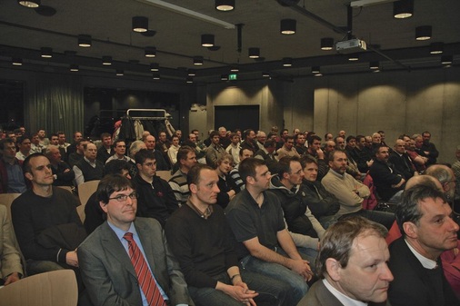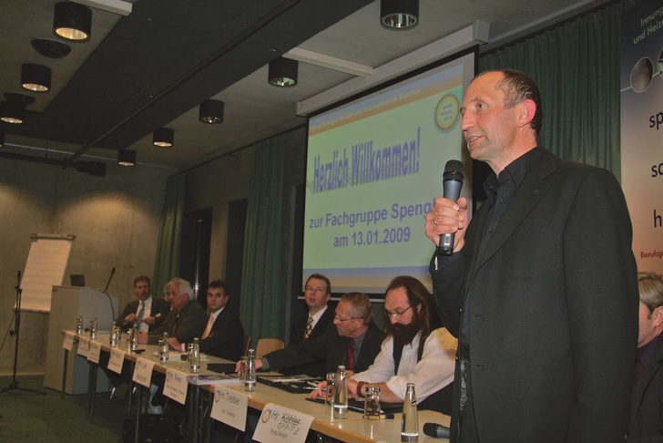 Die Spengler-Fachgruppenversammlung der Innung Spengler, Sanitär- und Heizungstechnik München veranstaltete im Rahmen der Bau 2009 ein Spengler-Fachforum, auf dem 120 Teilnehmer mit Vertretern der Trennlagen-, Haft- und Metallhalbzeugindustrie diskutierten. Das weit gefasste Thema „Trennlagen und Hafte bei Metalldächern aller Art – Produkte und Eigenschaften“ erregte dabei die Gemüter überaus interessierter Klempner- und Spenglerkollegen. Die von Fachgruppenleiter Ulrich Leib (rechts) moderierteVeranstaltung wurde mit zum Teil sehr knackigen und auf wesentliche Inhalte beschränkten Statements eröffnet. Im direkten Anschluss an die Kurzvorträge der Trennlagenhersteller Beco Bermüller und BWK, der Hafthersteller Rees und SM-Systeme sowie den MetallhalbzeugHerstellern und -Lieferanten Arcelor Mittal Sersheim - Stainless Service Germany, KME Germany AG, Prefa und Rheinzink folgte eine lebhafte Podiumsdiskussion.