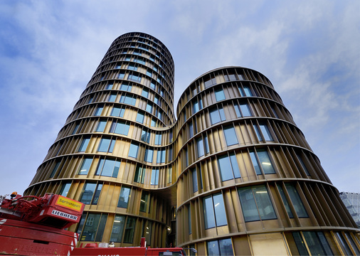 Die dänische Züblin A/S erhielt den Auftrag für die schlüsselfertige Erstellung des Bauwerkes mit einer Auftragssumme von 103 Mio. Euro. Das Objekt umfasst 23 000 m² Büro- und Ladenflächen, hat bis zu 15 Obergeschosse und fünf Untergeschosse mit Tiefgaragen und Technikräumen von nochmals 18 000 m². Mit der Ausführung der anspruchsvollen Fassade wurde die kompetente, international tätige FKN-Gruppe aus Neuenstein in Baden-Württemberg betraut. Die Gebäudestruktur stellte extreme Anforderungen an die Ausführungsplanung. 10 bis 15 Ingenieure und CAD-Zeichner von FKN waren fast zwei Jahre lang damit beschäftigt, Konstruktion, Detailplanung und Arbeitsvorbereitung der 1600 m² Pfosten-Riegel-Fassade und 13 000 m² Elementfassade zu erstellen.