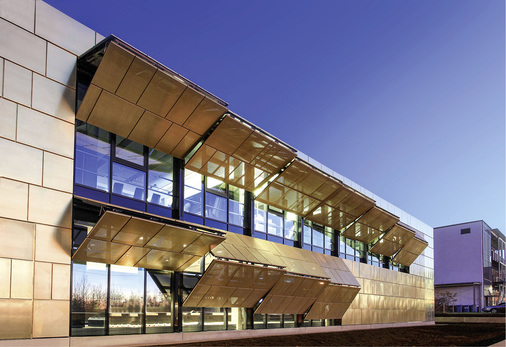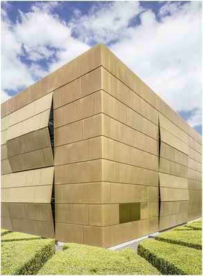Die optische und technische Abstimmung der Faltsysteme mit einer Gebäudehülle ist an der Firmenzentrale des Edelmetallhändlers Pro Aurum in München zu sehen. Am Neubau entstand eine vorgehängte, hinterlüftete Fassade, deren Kassetten aus Kupferprofilen der Marke KME Tecu Gold bestehen. Im Design spiegelt sich der Edelmetallhandel mehrfach wider, vor allem im Farbton der Profile. Die Kombination der goldenen Farbe mit der äußeren Form des quaderförmigen Gebäudes erinnert an einen riesigen Goldbarren, der dem Bauwerk zum Namen „Goldhaus“ verhalf. Der Werkstoff Tecu Gold besteht aus einer kalt formbaren, korrosionsbeständigen Kupferlegierung, die einen Anteil Aluminium enthält. Unter dem Einfluss der Witterung mattierte das Material am Gebäude und entwickelte die markante goldbraune Oberfläche.