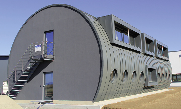 Weniger offenkundig sind die vielen planerischen Ideen und technischen Raffinessen, die in der komplett runden Titanzink-Fassade mit ihren ungewöhnlichen Bullaugen im Untergeschoss sowie den markanten Gauben darüber stecken. „Wir haben schon in der Planungsphase intensiv und in einer tollen Atmosphäre mit dem Architekten und der Fachberatung von Rheinzink zusammengearbeitet“, erinnert sich Mathias Dörr, der mit seiner Baublechnerei aus Teningen-Nimburg die Bekleidung ausgeführt hat. „Stunden über Stunden haben wir zusammengesessen, um gemeinsam realisierbare Details für die spannende Architektur zu entwickeln. Rund ein Vierteljahr hat allein die Festlegung der Logistik und der Abläufe, inklusive des Modellbaus für die Bullaugen, gedauert.“