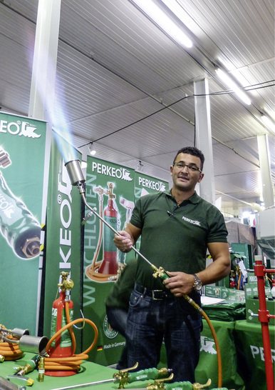Unweit des praktischen Coillagers erregte Yassine Hönes mit seinem Perkeo-Team Aufsehen. In regelmäßigen Abständen führte der Spezialist für Lötgeräte und Aufschweißbrenner den jüngsten Spross der Perkeo-Familie vor – den sogenannten Bullfire. Dabei handelt es sich um einen extrem leistungsstarken Aufschweißbrenner, der eine Flamme von bis zu 1 m Länge erzeugt (siehe auch Titelbild zu diesem Beitrag bzw. Seite 39 in vorliegender Ausgabe).