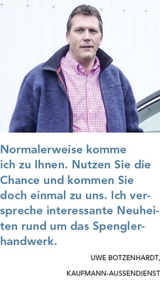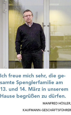 Ich freue mich sehr, die gesamte Spenglerfamilie am 13. und 14. März 2015 in unserem Hause begrüßen zu dürfen“, sagt Kaufmann-Geschäftsführer Manfred Hösler. Die Vorfreude auf das große Ereignis ist ihm deutlich anzumerken. Und obwohl er die alle zwei Jahre stattfindende Kaufmann-Hausmesse bereits unzählige Male miterlebt hat, ist eine gewisse Spannung spürbar. Wie hoch ist der aktuelle Informationsbedarf der Kunden? Wird es uns erneut gelingen, unsere Besucher zu begeistern? Wie professionell werden unsere Geschäftspartner in diesem Jahr auftreten? Fragen wie diese sind ausdrücklich erlaubt, denn sie helfen, stets das Beste zu geben. „Sobald sich Routine einschleicht, lässt die Begeisterung für eine Sache nach“, ist sich Hösler sicher und er fügt an: „Unser Team um Hausmesse-Organisator Thorsten Schalk ist hoch motiviert und wird unseren Gästen zahlreiche Neuigkeiten vorstellen.“
