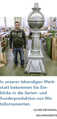 Arbeiten ist schön, ich könnte stundenlang zusehen! Kein Problem – genau das ist bei Kaufmann möglich. Interessierte Fachbesucher können entweder den Kaufmann-Ornamenten-Spenglern über die Schultern sehen oder aber mit den Schülern der Schweinfurter Spenglermeisterschule in der Meisterwerkstatt über die hohe Kunst der Spenglerei diskutieren. In beiden Fällen zeigen die Fachleute in ihren Schauwerkstätten, wie besondere Werkstücke angefertigt werden. Und selbstverständlich präsentiert Kaufmann auch eine Auswahl der in diesem Jahr an der Stuttgarter Robert-Mayer-Schule angefertigten Meisterstücke.