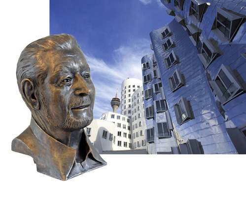 Es folgten zahlreiche Begegnungen, die sich, wie kann es anders sein, fast immer auf dem Klempnertag ereigneten. Zu gerne erinnere ich mich an die verdutzten Gesichter der Zuhörer bei der Vorstellung der Fassade des neuen Düsseldorfer Zollhofes. Eine derartige Gebäudehülle hatte Klempnerdeutschland zuvor noch nie gesehen (oben). Nebenbei bemerkt bin ich nicht sicher, ob der Begriff Gebäudehülle damals bereits geläufig war. Wie dem auch sei – die gekrümmte Edelstahlfassade fasziniert die Fachwelt bis heute. Die 1998 nach Entwürfen von Stararchitekt Frank Gehry entwickelte Gebäudehülle fasziniert durch den konsequenten Verzicht auf Sockel und Gesimse jeglicher Art. Überhaupt markierte die Edelstahlfassade des Zollhofs den Beginn einer bis heute andauernden Serie herausragender Metall-Architektur.
