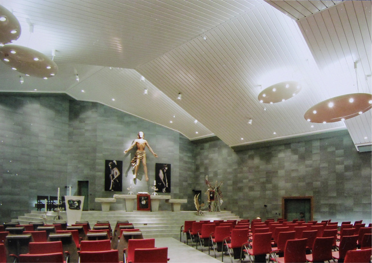 Die Decke des sakralen Bauwerkes besteht aus farbbeschichtetem Aluminium. Gefertigt und montiert wurden die perlweiß beschichteten Aluminiumpaneele vom Team Dangel-Metall GmbH aus Oberlenningen. Und auch die Unterkonstruktion der abgehängten Aluminiumdecke stammt vom Fachbetrieb Dangel, der seine Metallpaneele seit vielen Jahren erfolgreich vermarktet. Obwohl die gelungene Arbeit rund um die Aluminiumdecke der Evangelischen Bruderschaft Kecharismai bereits im Jahr 2005 fertig gestellt wurde, erfuhr die Fachwelt bislang nur wenig darüber. Erstaunlich, denn der Fachbetrieb Dangel sowie die Blumenmönche selbst betreiben eine hervorragende Öffentlichkeitsarbeit. So ist der harmonisch gestaltete Innenraum der Christ-König-Kirche beispielsweise in gedruckten Chroniken der Bruderschaft sowie auf deren Internetseite www.ebk-blumenmönche.de zu sehen.