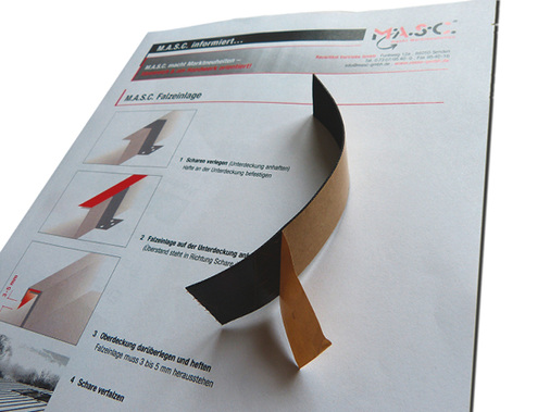 Laut M.A.S.C. darf bei fachgerechter Anwendung das Gummi der Falzeinlage nach dem Falzvorgang nicht sichtbar sein. Sofern mit Falzmachinen gearbeitet wird, empfiehlt M.A.S.C. eine Probeverfalzung.