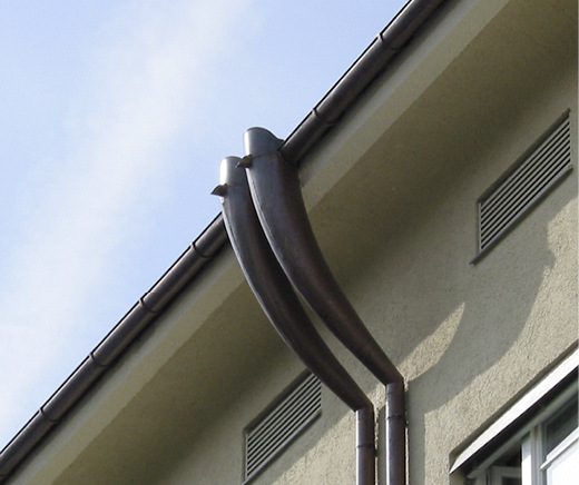 Bei der Münchner Ornamentenmanufaktur Lorenz Sporer kennt man sich mit der Rekonstruktion historischer Blechbauteile bestens aus. Neben Zinkverzierungen an Dachgauben, Schmuckgesimsen aus Kupfer oder vergoldeten Dachspitzen und Wetterfahnen stellt das traditionsverbundene Unternehmen auch unterschiedliche Wasserfangkästen nach alten Vorlagen her. Für die Sanierung einer im Münchner Volksmund als zwölf Apostel-Blöcke bekannten, um 1930 erbauten Wohnanlage, fertige das Team um Geschäftsführerin Caroline Sporer wunderschöne geschwungene Kupferbögen an. Mit einer Länge von etwa 1600 mm und einem oberen Durchmesser von 310 mm führen die konischen Bögen das Niederschlagswasser sicher zu den direkt angeschlossenen 120-mm-Rohren. Die Bögen bestehen aus zwei Kupfer-Halbschalen. An der Einlauföffnung sind sie mit einer Drahteinlage sowie einem Notüberlauf ausgestattet.