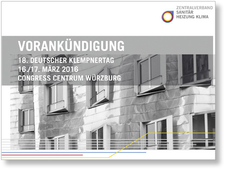 Am 16. und 17. März 2016 ist es endlich wieder so weit! Dann trifft sich die Crème de la Crème der Szene zum 18. Deutschen Klempnertag im Congress Centrum Würzburg. Der Deutsche Klempnertag zählt europaweit zu den wichtigsten Branchentreffen der Zunft. Entsprechend vielfältig informiert die ZVSHK-Veranstaltung über aktuelle Neuigkeiten aus der Klempnertechnik. Unter anderem klärt der Klempnertag über die Themen