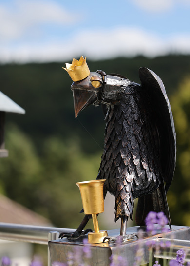 Die Stars der Gürtlerei Schulze sind zweifellos der bekrönte Rabe an der Zufahrt zum Firmengelände und dessen Küken. Letzteres wurde mit beginnendem Frühling flügge und arbeitet seither als BAUMETALL-Maskottchen. Die Reportage über die Rabenmutter war in BAUMETALL 8/2023 zu lesen – unterhaltsame Infos zum Rabenküken sind einschließlich Video und dazu passender Leseraktion online abrufbar. Übrigens ist Wissenswertes zum Rabenvater auch auf Seite 49 dieser Ausgabe zu finden.