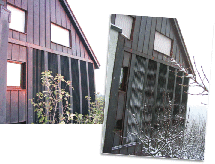 Im Vergleich dazu stellt unser System eine sinnvolle und interessante Alternative dar. Einerseits kann das System bereits beim Hausbau in das Dach eingebaut werden. Das Dach erfüllt dann gleich zwei Funktionen: solide Metallbedachung und Kollektor. Eine problemlose Nachrüstung ist ebenso möglich. Neben der Dachfläche ist das System auch für den Einsatz an Fassaden geeignet. Da besonders im Winter der Einstrahlwinkel der Sonne in einem flachen Winkel steht, sind Fassaden bestens zur Wärmeenergiegewinnung geeignet. Zudem können etwa sanierungsbedürftige Wandflächen durch die Metallbekleidung dauerhaft und wartungsfrei geschützt werden.